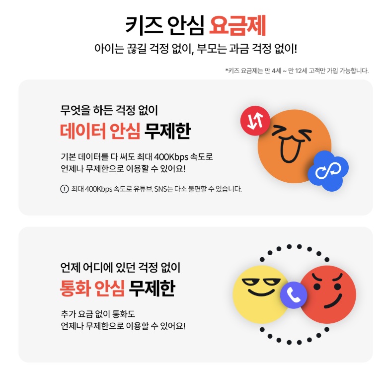 - A. 키즈 전용 요금제는 만 13세가 되는 시점에 익월 1일 자동 전환 안내가 함께 표시됩니다. 장기 유지 목적이라면 전환 요금제까지 고려해두세요.