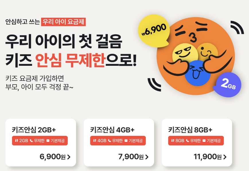 최저가 요금은? 결론부터 말하면 “키즈 안심 2GB+ (월 6,900원)”